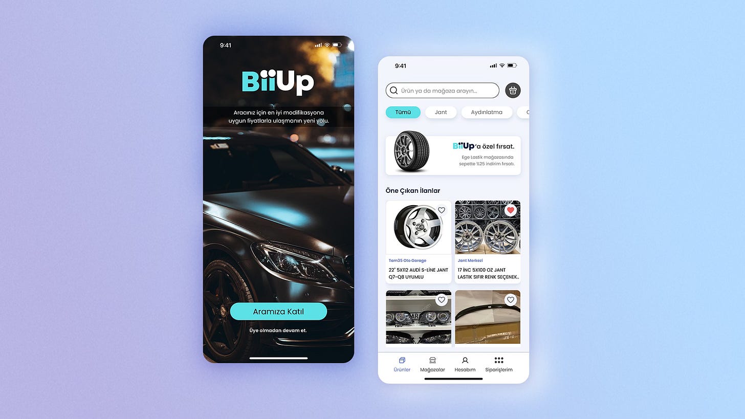 BiiUp UI/UX vaka çalışması: Otomobil parçaları ve aksesuar pazaryeri için tasarlanan modern, hızlı ve kullanıcı dostu mobil uygulama arayüz süreçlerini inceleyin.