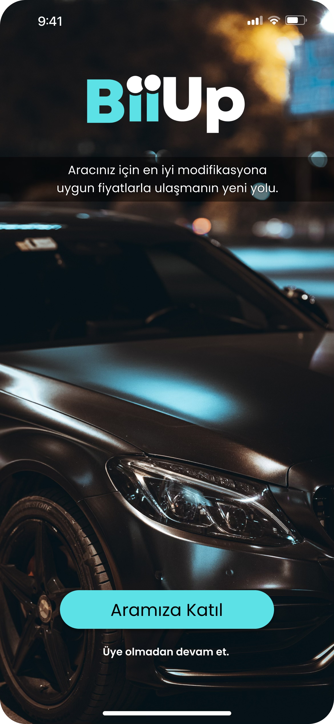 Bir mobil uygulamanın en kritik anı, kullanıcının uygulamayı açtığı ilk 3 saniyedir. BiiUp’ın açılış ekranında (Splash Screen), sektörel derinliği hissettiren düşük ışıklı, prestijli bir otomobil görseli kullandık.